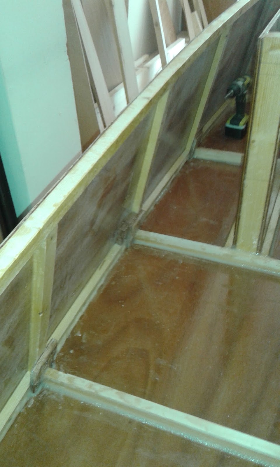 We've also cut out all the pieces for two more flat wheeled dollies to support the main hull upside down. We'll turn the hull next time (with some help I think) to glue up the bottom.